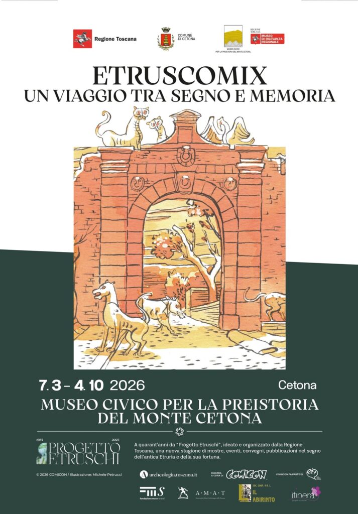 Dal 7 marzo al 4 ottobre il Museo Civico per la Preistoria di Monte Cetona ospita l’esposizione Etruscomix: un viaggio tra segno e memoria un progetto di COMICON che ha segnato una tappa fondamentale nel percorso di valorizzazione del fumetto come linguaggio d’arte e di divulgazione culturale. L’inaugurazione si terrà sabato 7 marzo alle 11.
