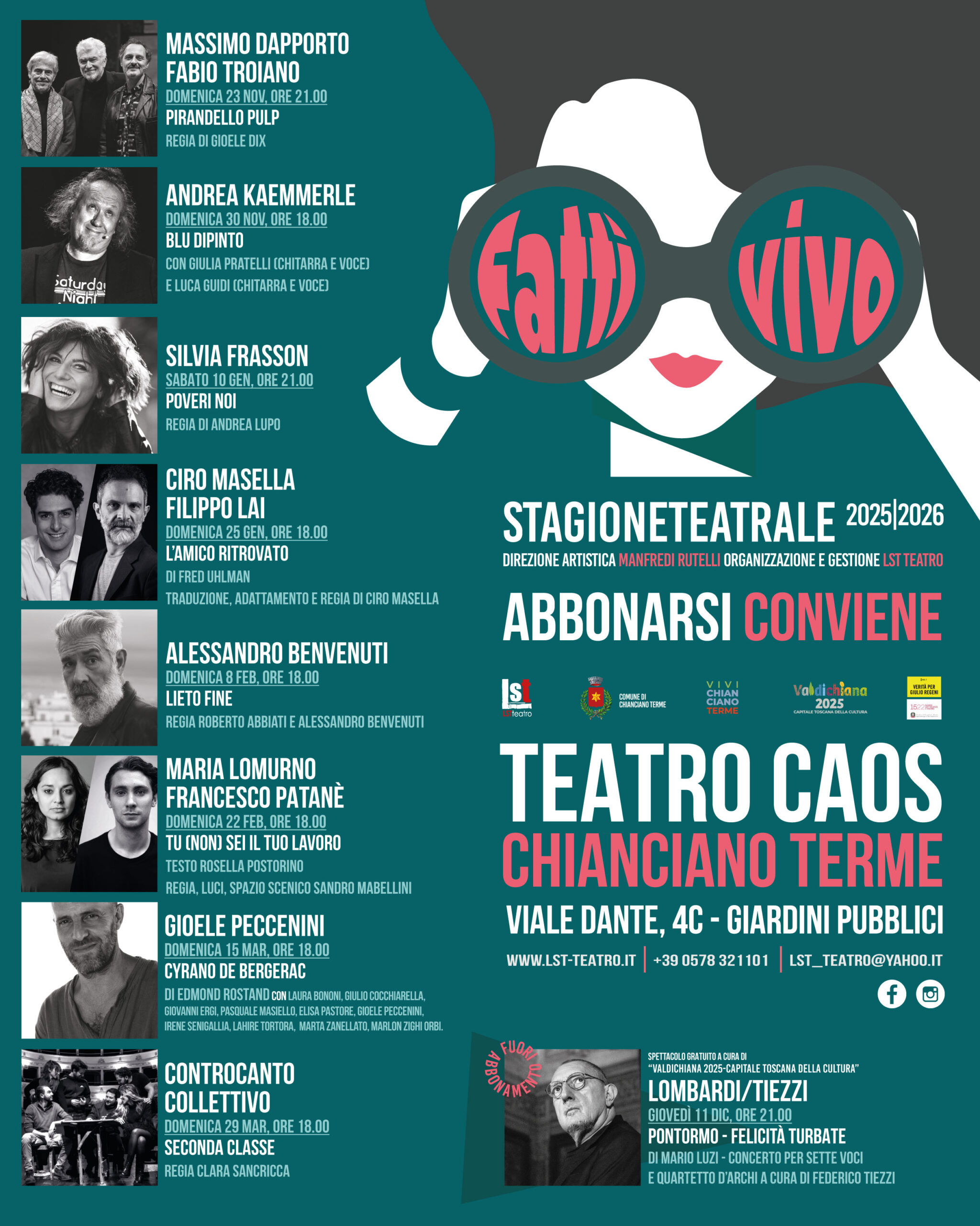 Il Teatro Caos di Chianciano Terme, sotto la direzione artistica di Manfredi Rutelli, lancia la sua nuova stagione teatrale 2025-2026 “Fatti Vivo!”, un invito a riscoprire il teatro come esperienza viva, imprevedibile e provocatoria. Una programmazione ricca e variegata, che spazia dal classico rivisitato al contemporaneo, dal dramma alla commedia, coinvolgendo artisti di rilievo del panorama nazionale.