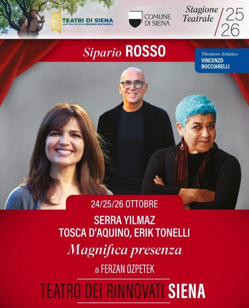 Si alza il sipario sulla stagione 2025-2026 dei Teatri di Siena, per la direzione artistica di Vincenzo Bocciarelli. La serata inaugurale, con il red carpet all’interno del Cortile del Podestà e una sfilata di grandi nomi del mondo dello spettacolo, è in programma venerdì 24 ottobre a partire dalle 20. Quindi il via, alle 21, al primo fine settimana di spettacoli, con l’apertura del “Sipario Rosso” al Teatro dei Rinnovati: protagonista la commedia di Ferzan Ozpetek “Magnifica presenza” con Serra Yilmaz.