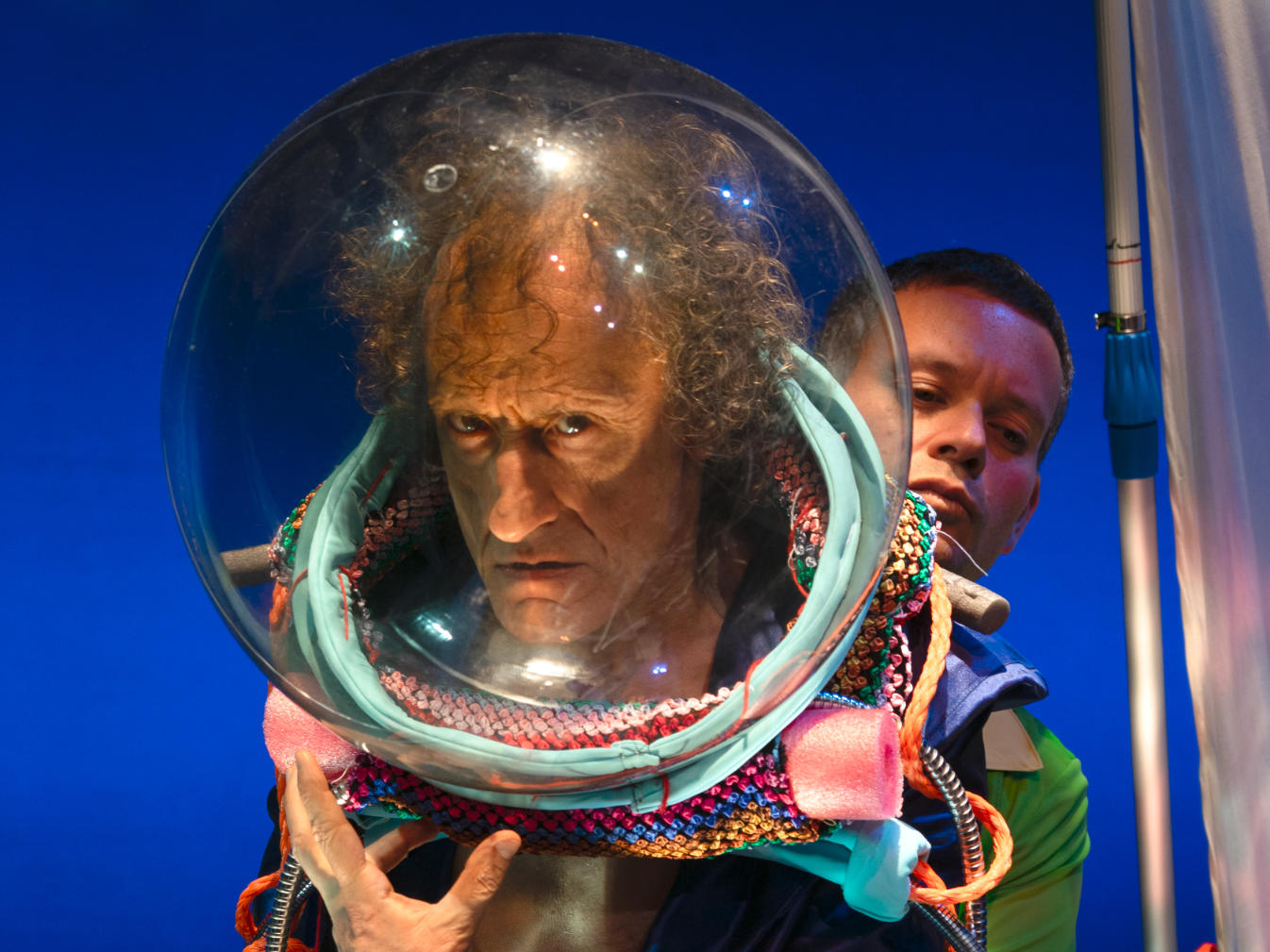 Nel cuore dello spettacolo un personaggio-simbolo: un ammiraglio in tuta blu elettrico – interpretato da Antonio Rezza – che tenta di salvare la sua nave, combattendo ossessioni di mercato, visioni contrastanti e un equipaggio ostinato. Una “nave” che può diventare astronave e metafora dello smarrimento contemporaneo, tra l’idea di salvezza e l’allontanamento dalla propria volontà.