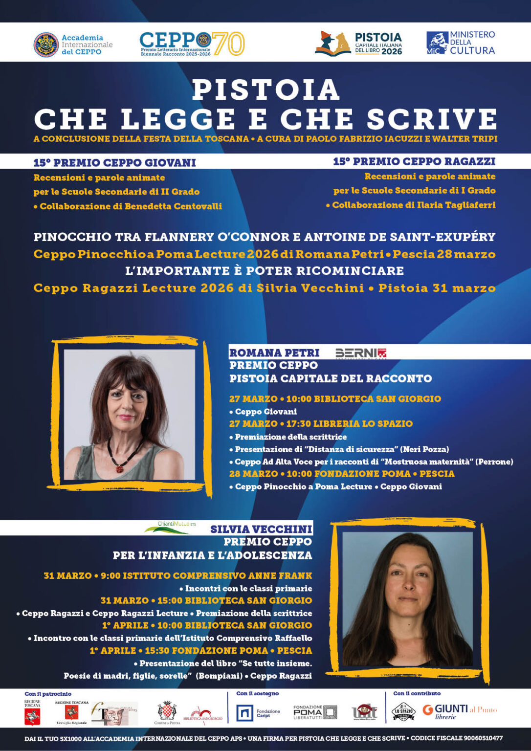 È stata candidata al Premio Strega nel 1998 con Alle Case Venie e nel 2013 con Figli dello stesso padre. Ha vinto premi come Mondello e Grinzane Cavour. È tradotta in Germania, Stati Uniti, Inghilterra, Francia e Portogallo. In particolare, ha pubblicato tre romanzi per Mondadori, che sono stati recensiti dai giovani: “La ragazza di Savannah” (su Flannery O’Connor), “Rubare la notte” (su Antoine de Saint-Exupéry) e “Figlio del lupo” (su Jack London).Martedì 31 marzo 2026 ore 15 • Pistoia, Biblioteca San Giorgio Auditorium Terzani • SILVIA VECCHINI, Premio Ceppo per l’Infanzia e l’Adolescenza, terrà la lecture “L’importante è poter ricominciare”.
