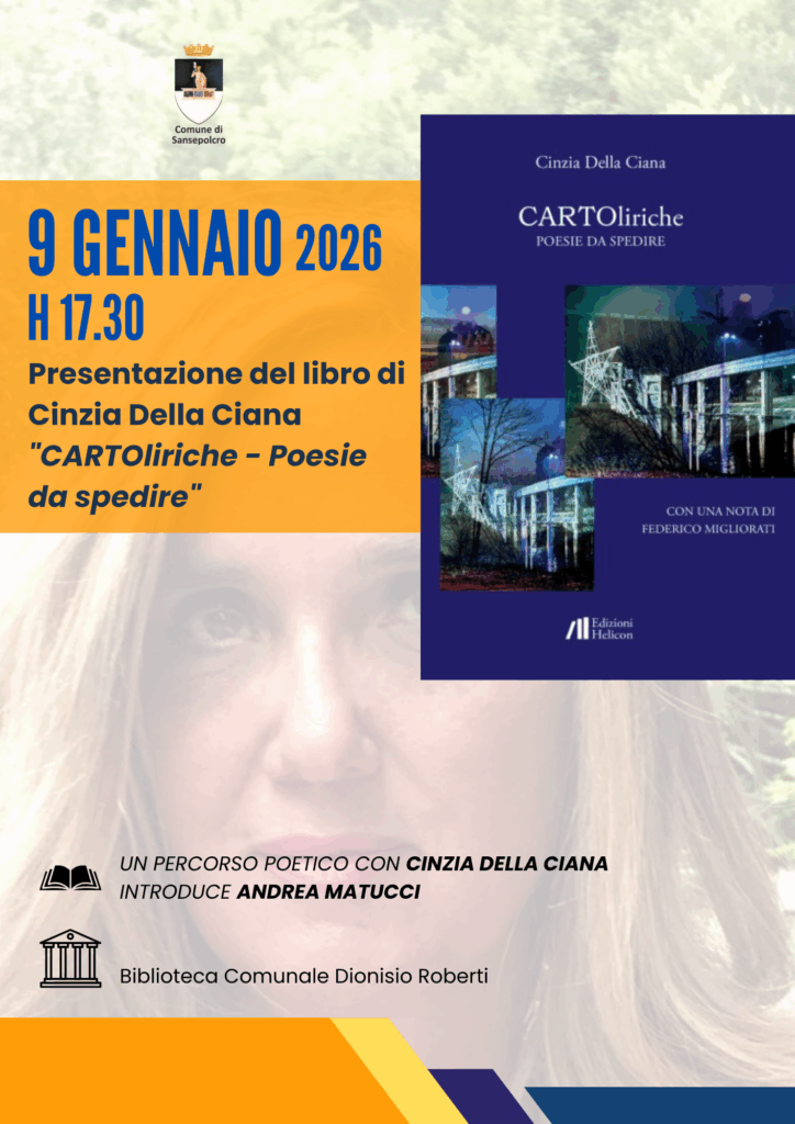Cinzia Della Ciana sarà la protagonista dell’incontro di venerdì 9 gennaio a Sansepolcro. Alle 17.30 alla Biblioteca comunale Dionisio Roberti verrà presentato il libro “CARTOliriche – Poesie da spedire” (Helicon)