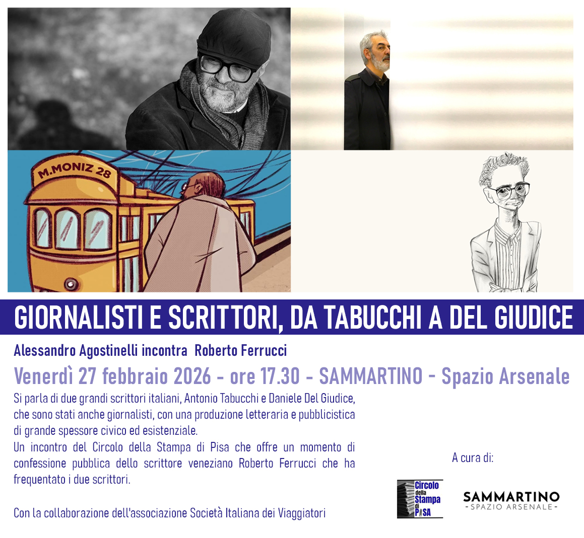 Un incontro tra giornalismo e letteratura dedicato a due grandi scrittori italiani: Antonio Tabucchi e Daniele Del Giudice. L'appuntamento è al Circolo della Stampa di Pisa (Spazio Arsenale Sammartino in via San Martino) venerdì 27 febbraio alle 17.30. Ospite lo scrittore veneziano Roberto Ferrucci che ha conosciuto entrambi gli autori e con loro ha scambiato esperienze di vita e letterarie.