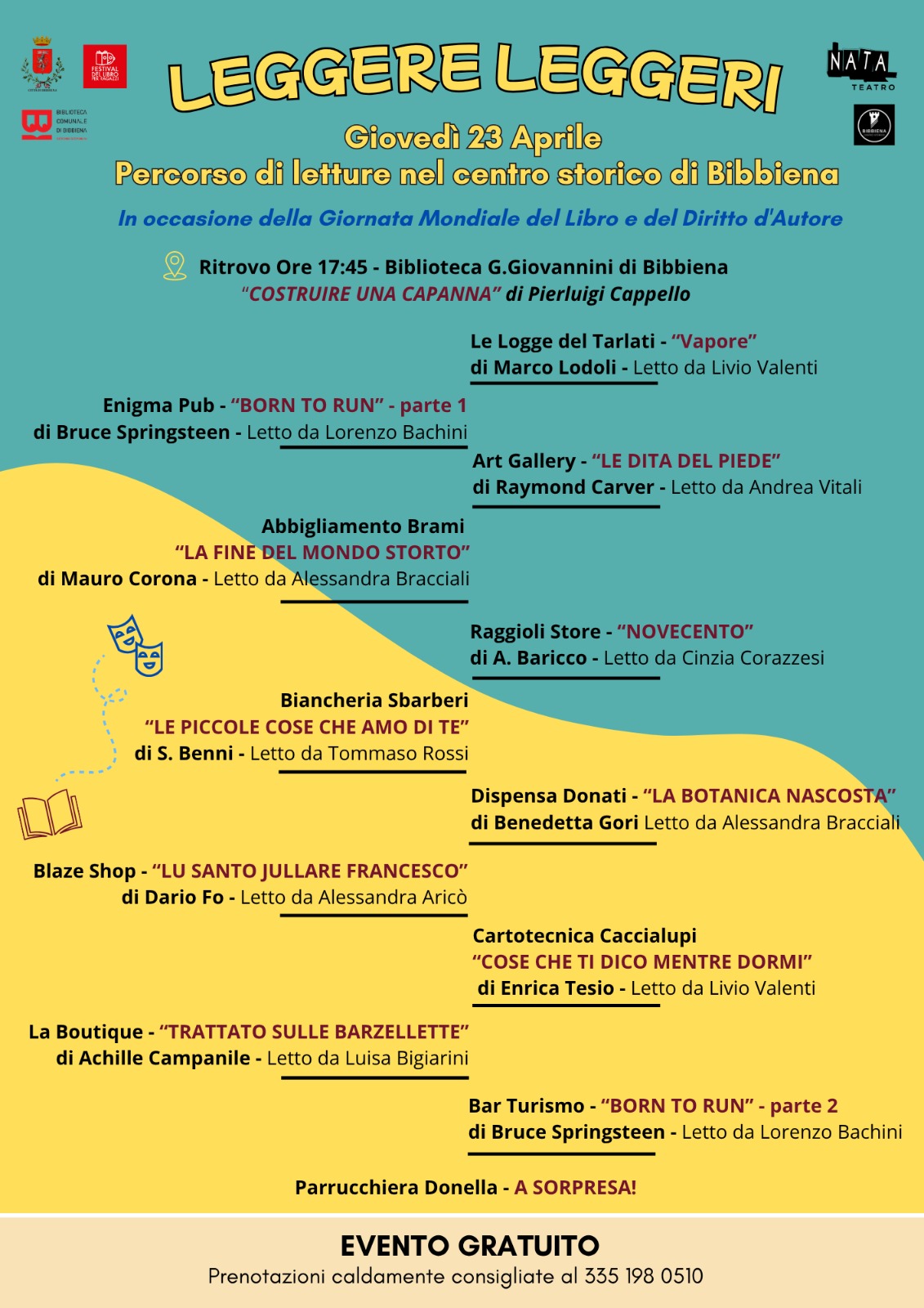 Il 23 Bibbiena organizza un percorso di lettura composto da 12 tappe, nei negozi del centro storico. Il ritrovo e la partenza del corteo di lettura sarà alle 17,45 presso la Biblioteca Giovannini e da qui, con gli attori di Nata, si leggeranno brani dai classici della letteratura, in 12 negozi del centro storico che hanno dato la loro disponibilità a ospitare questo momento di riflessione e comunità.
