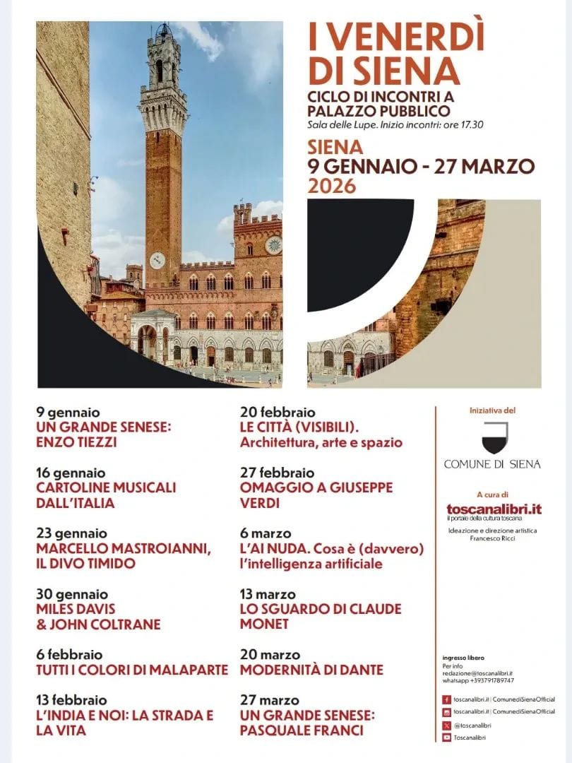 Torna l’attesissimo ciclo di incontri culturali “I Venerdì di Siena”, l’iniziativa del Comune di Siena che trasforma la suggestiva Sala delle Lupe di Palazzo Pubblico in un salotto vivo di idee, dialoghi e scoperte. A partire da venerdì 9 gennaio alle ore 17.30, e con cadenza settimanale fino al 27 marzo, dodici appuntamenti imperdibili attendono il pubblico per esplorare il patrimonio culturale senese e le grandi questioni del nostro tempo.