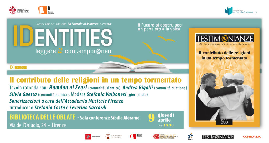 Un interessante appuntamento alla Biblioteca delle Oblate di Firenze. Giovedì 9 aprile alle 18.30, la Sala Conferenze Sibilla Aleramo (via dell’Oriuolo 24) ospita la tavola rotonda dal titolo “Il contributo delle religioni in un tempo tormentato” a partire dal volume 566 della rivista “Testimonianze”.
