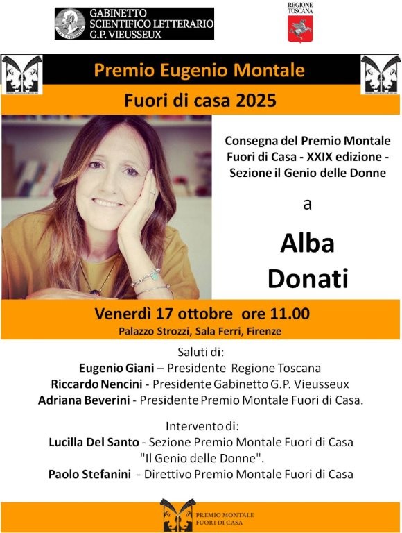 Dopo aver premiato nelle precedenti edizioni la giornalista Lucia Goracci, l’attrice Laura Morante, le scrittrici Sandra Bonsanti e Anna Luisa Pignatelli, la professoressa Sabina Nuti, rettrice della Scuola Superiore Sant’Anna di Pisa, il Premio – patrocinato dalla Regione Toscana – verrà assegnato ad Alba Franceschini, meglio nota come Alba Donati, raffinata poetessa, scrittrice ed editrice che dal 2016 al 2023 ha ricoperto la carica di presidente di quello stesso Gabinetto Vieusseux dove riceverà il riconoscimento.