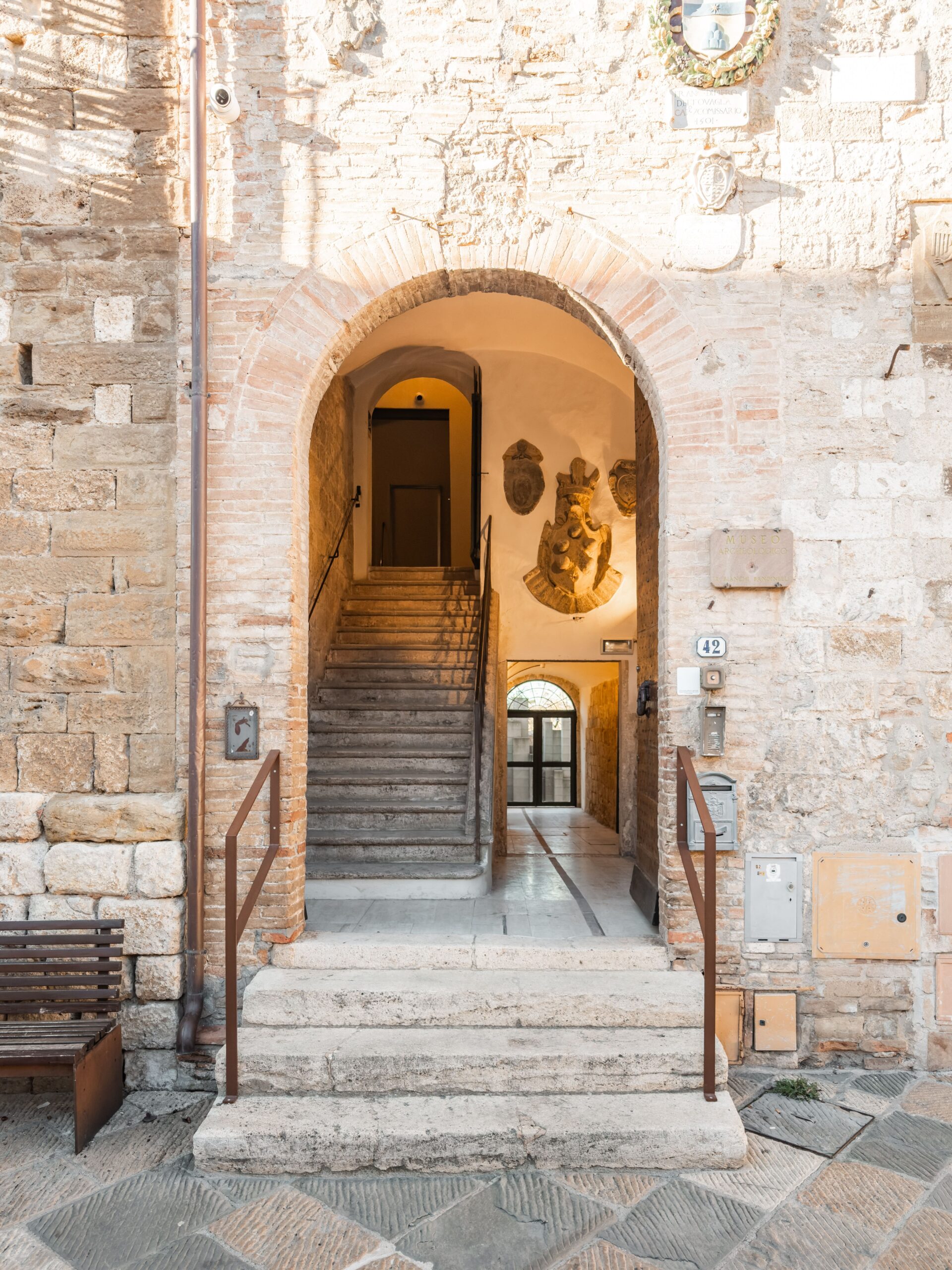 È proprio il piano terra del Palazzo, aggiuntivo rispetto al percorso museale archeologico, a costituire il primo forte legame tra città e palazzo. Uno spazio “pubblico” visitabile e transitabile liberamente che permette al visitatore di scoprire luoghi ad oggi quasi segreti come il Giardino delle Arti e le Stanze della Memoria, ricevendo anche delle informazioni relative agli eventi temporanei e permanenti che interessano il palazzo e scoprendo il legame tra museo e la necropoli etrusca di Dometaia.