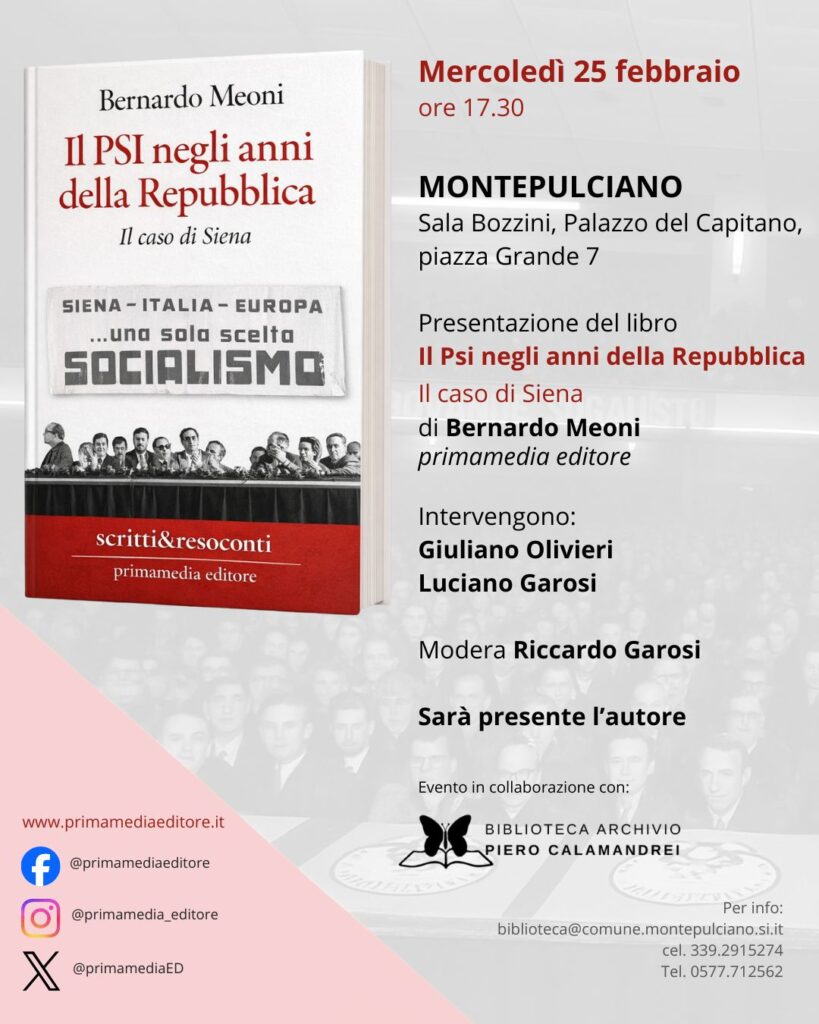 Di questo tratta il volume di Bernardo Meoni “Il Psi negli anni della Repubblica. Il caso di Siena” (primamedia editore) che verrà presentato mercoledì 25 febbraio alle 17.30 alla Biblioteca Archivio Calamandrei (Sala Bozzini, Palazzo del Capitano, piazza Grande 7). Oltre all’autore interverranno Giuliano Olivieri e Luciano Garosi; modera Riccardo Garosi.
