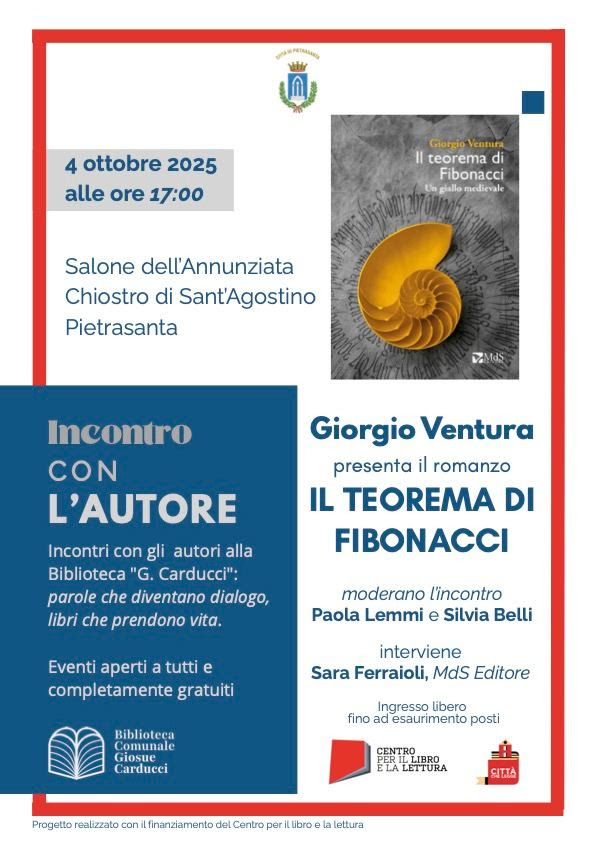 Prima presentazione assoluta per "Il teorema di Fibonacci" di Giorgio Ventura, nell’ambito di Pietrasanta Medievale. Appuntamento sabato 4 ottobre alle 17 nel Salone dell'Annunziata del Chiostro di Sant'Agostino. Moderano l'incontro Paola Lemmi e Silvia Belli; interviene Sara Ferraioli di MdS Editore. Ingresso libero fino ad esaurimento posti.