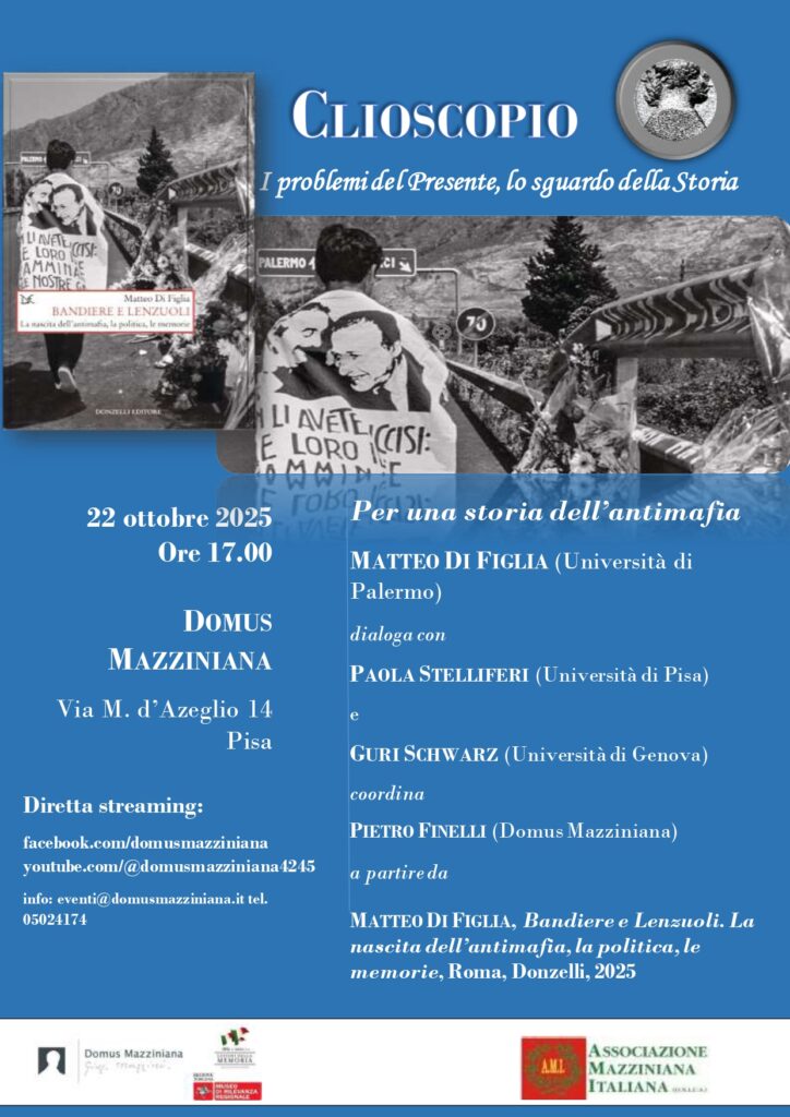 Alla nascita dell’antimafia, alle sue radici, ma anche all’incontro con le altre liturgie pubbliche, a partire al ricordo della Shoah che si consolida proprio negli stessi anni grazie all’istituzione del Giorno della Memoria, è dedicato il volume di Matteo Di Figlia, docente di storia contemporanea all’Università di Palermo, "Bandiere e Lenzuoli. La nascita dell’antimafia, la politica, le memorie" (Donzelli) che sarà discusso mercoledì 22 ottobre alle 17 alla Domus Mazziniana di Pisa - e on line sui canali social della stessa Domus Mazziniana - da Paola Stelliferi, ricercatrice dell’Università di Pisa, Guri Schwarz, docente di storia contemporanea all’Università di Genova e dal direttore della Domus Mazziniana, Pietro Finelli.