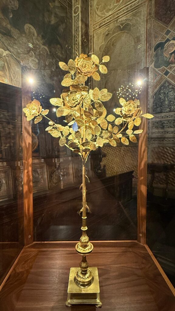 La Rosa d’Oro è un dono che i papi offrivano annualmente a chiese, santuari, città e personaggi illustri, in segno di riguardo e ammirazione ma anche per tessere relazioni politiche e, spesso, per riaffermare la propria influenza sui territori.