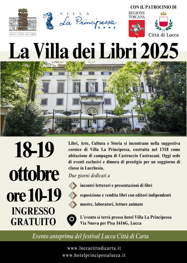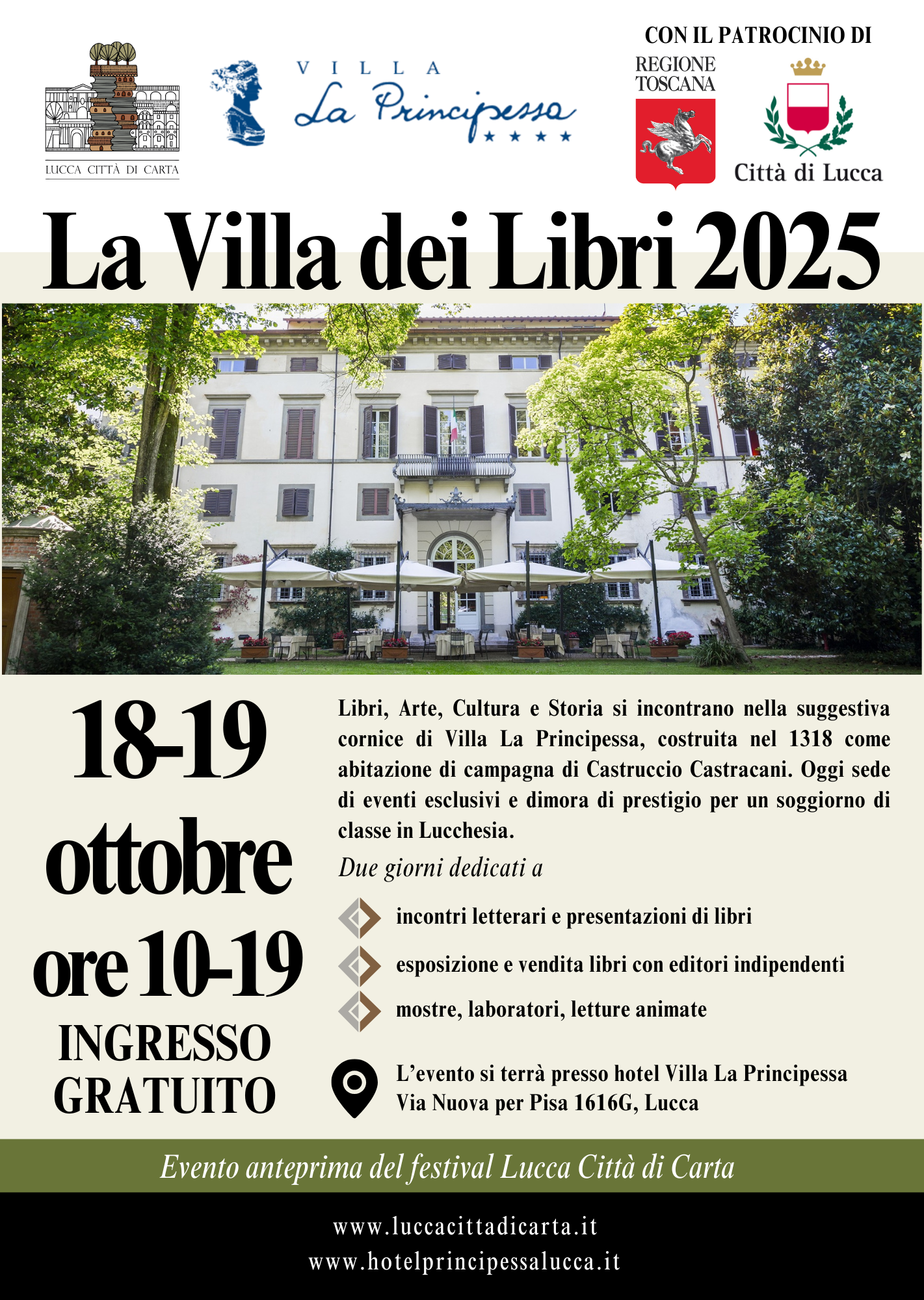 Torna la rassegna letteraria “La villa dei libri”, giunta alla terza edizione, anteprima del festival Lucca Città di Carta 2026. L’evento, patrocinato dal Comune di Lucca e dalla Regione Toscana, si terrà sabato 18 e domenica 19 ottobre, dalle 10 alle 19, nella suggestiva cornice di Villa la Principessa (via Nuova per Pisa 1616/G, Lucca – ampio parcheggio), anche quest’anno a ingresso gratuito.