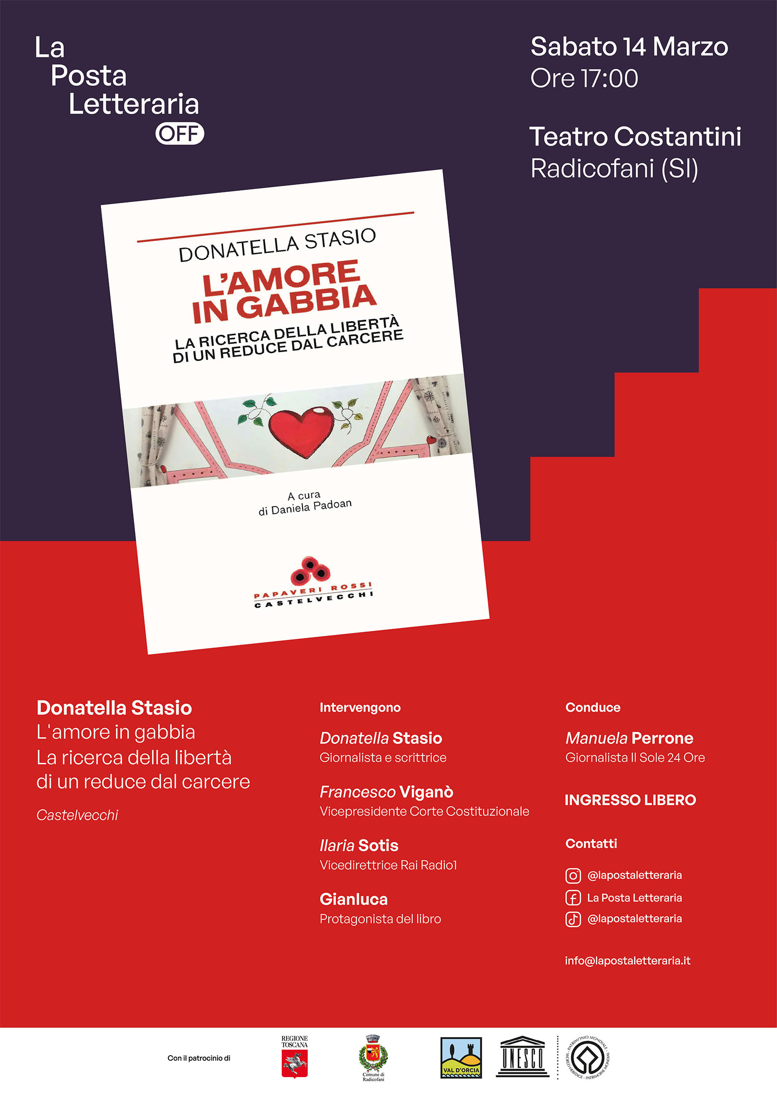 Sabato 14 marzo alle 17 il Teatro Costantini di Radicofani (SI) ospita un nuovo appuntamento de La Posta Letteraria OFF, il ciclo di incontri e approfondimenti nato nel 2024 come estensione del festival La Posta Letteraria, considerato oggi “il più grande festival di libri fuori dalle grandi città”, ideato nel 2019 da un collettivo di giovani del posto. In attesa di conoscere le date e il programma dell’ottava edizione del festival, prevista comunque a luglio, quest’appuntamento propone una discussione pubblica sul libro di Donatella Stasio “L’amore in gabbia. La ricerca della libertà di un reduce dal carcere” (Castelvecchi).