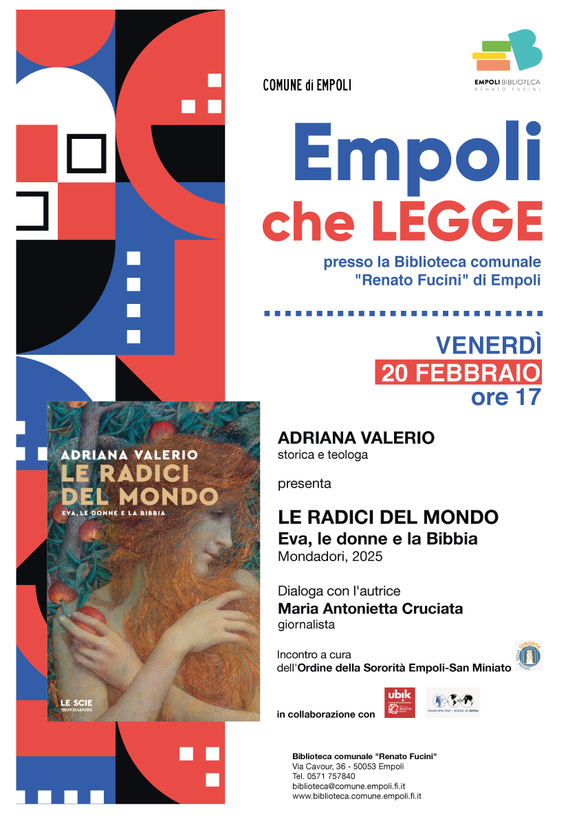 Un nuovo appuntamento con “Empoli che Legge”: ospite della rassegna Adriana Valerio. Storica e teologa presenterà il libro "Le radici del mondo. Eva, le donne e la Bibbia" (Mondadori) venerdì 20 febbraio alle 17, alla biblioteca comunale Renato Fucini di Empoli, in via Cavour 36. L’ingresso è libero. Dialogherà con l’autrice, Maria Antonietta Cruciata, giornalista. L’incontro è a cura dell’Ordine della Sororità Empoli-San Miniato e realizzato in collaborazione con Libreria Rinascita e Fidapa.