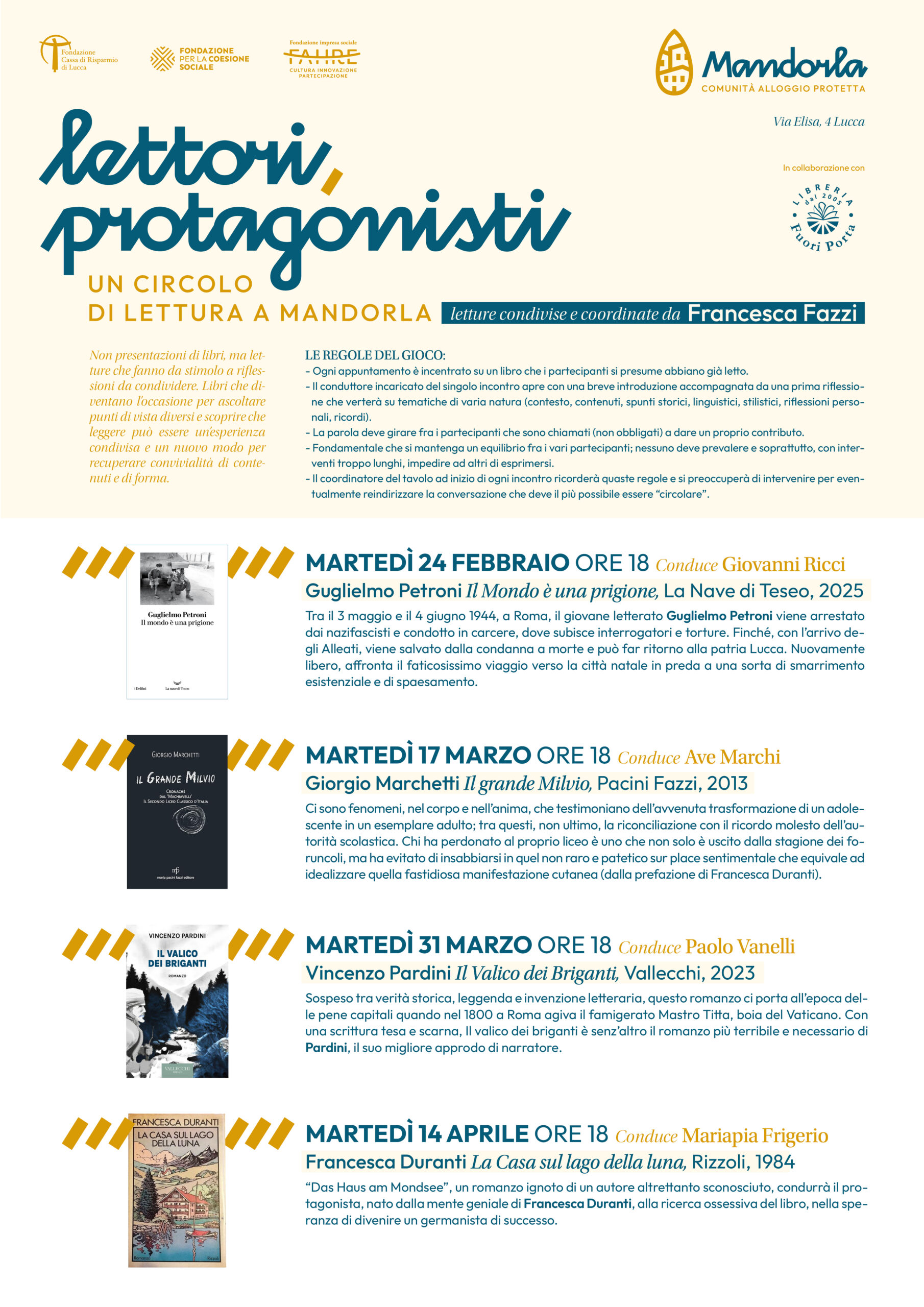 "Lettori protagonisti - dice Lucia Corrieri Puliti (presidente della Fondazione per la Coesione Sociale, ente strumentale della Fondazione Cassa di Risparmio di Lucca che promuove Mandorla in collaborazione con l'Impresa Sociale e Anffas) - è un'altra esperienza di welfare culturale ospitata dalla struttura in cui abitano persone con disabilità. Si aggiunge a un prezioso programma di eventi aperti al pubblico chiamato Pianostrada che da più di un anno propone iniziative culturali come concerti, rassegne teatrali, presentazioni di libri eventi artistici per la città e gli abitanti di Mandorla. Sono quattro appuntamenti con scrittori e intellettuali per condividere con la città altrettanti dialoghi su libri di grande valore storico e culturale".