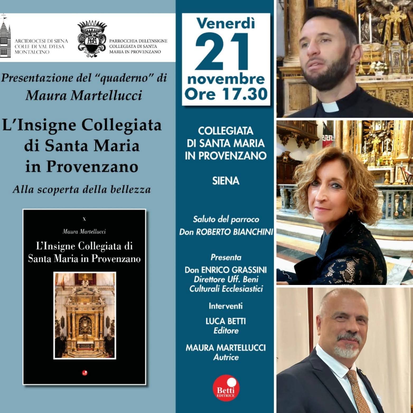 Un viaggio attraverso la storia della nascita della devozione della Madonna di Provenzano e della conseguente edificazione dell’Insigne Collegiata di Santa Maria in Provenzano a Siena. E' quello condotto da Maura Martellucci nel libro "L’insigne Collegiata di Santa Maria in Provenzano" (Betti Editrice) che verrà presentato venerdì 21 novembre alle 17.30 nella Collegiata di Santa Maria in Provenzano" a Siena.