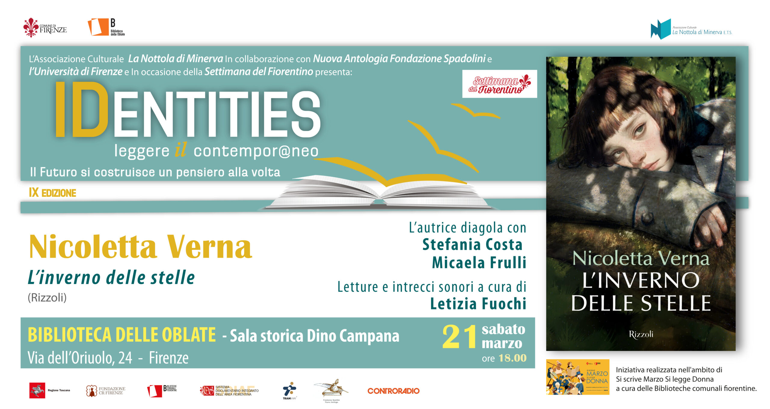 Iniziativa nell’ambito della rassegna IDENTITIES. Leggere il contemporaneo – Il futuro si costruisce un pensiero alla volta, giunta alla IX edizione e promossa dall’Associazione culturale La Nottola di Minerva ETS - grazie al contributo del Comune di Firenze, della Regione Toscana e della Fondazione CR Firenze - in collaborazione con la Biblioteca delle Oblate, con Nuova Antologia Fondazione Spadolini, l’Università di Firenze e Tram di Firenze S.p.A.