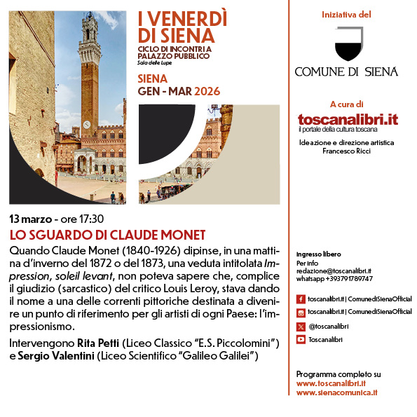 Un omaggio a Claude Monet nel centenario della morte. Il 13 marzo alle 17.30 nella Sala delle Lupe di Palazzo Pubblico nuovo appuntamento con I Venerdì di Siena dedicato al padre dell’impressionismo. Iniziativa del Comune di Siena a cura di toscanalibri.it per la direzione artistica di Francesco Ricci e la collaborazione di Massimiliano Bellavista.