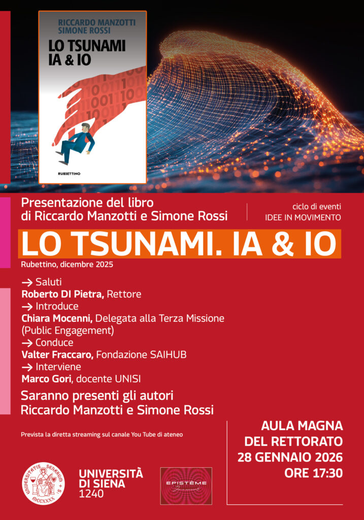 L’iniziativa, con ingresso libero ma per la quale è consigliata la registrazione on line sul sito di Ateneo (https://www.unisi.it/unisilife/eventi/presentazione-del-libro-lo-tsunami-ia-io), si inserisce nell’ambito della collaborazione tra l’Università di Siena e il Circolo culturale Epistème e fa parte del ciclo "Idee in movimento" della Terza Missione (Public Engagement).