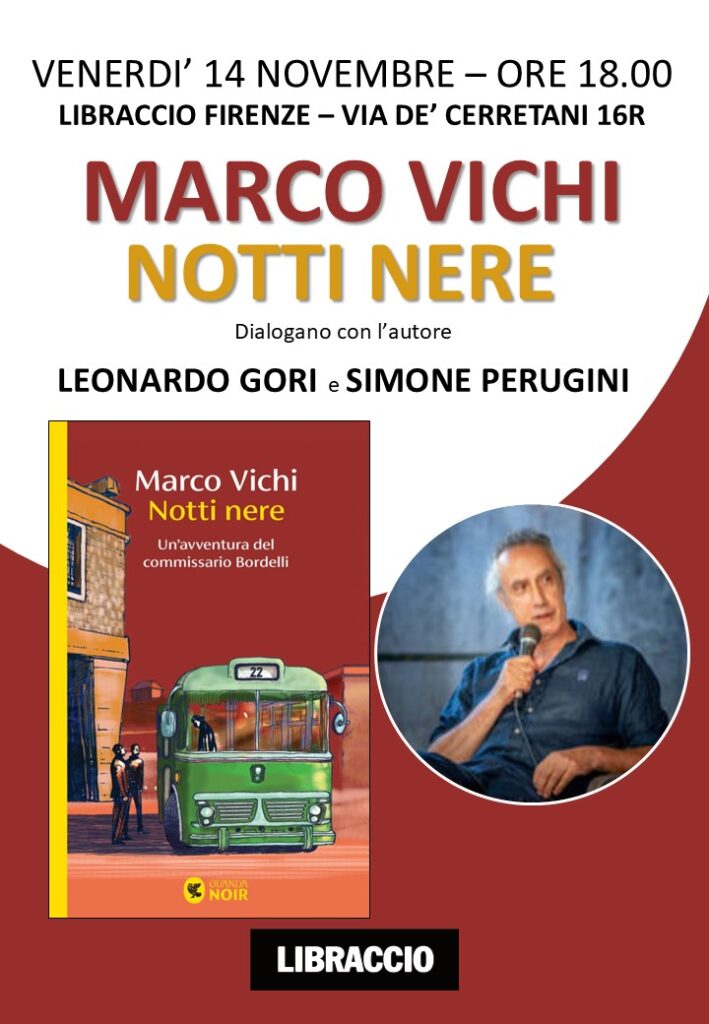 Verrà presentato venerdì 14 novembre a Firenze "Notti nere" (Guanda), il nuovo romanzo dello scrittore Marco Vichi. L'appuntamento è alle 18 alla libreria Libraccio in via de' Cerretani 16r. Dialogano con l'autore Leonardo Gori e Simone Perugini.