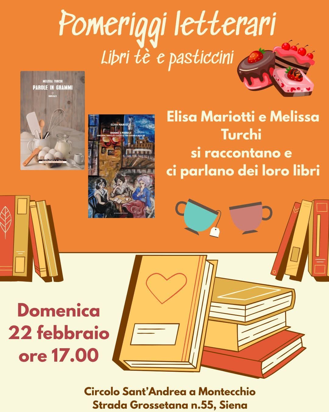 Due donne, due romanzi, tè e pasticcini. Sono gli ingredienti del pomeriggio letterario in compagnia di Elisa Mariotti e Melissa Turchi organizzato domenica 22 febbraio alle 17 al Circolo Sant’Andrea a Montecchio di Siena, in strada Grossetana 55. Per le due autrici sarà l’occasione di raccontarsi e parlare dei loro libri.