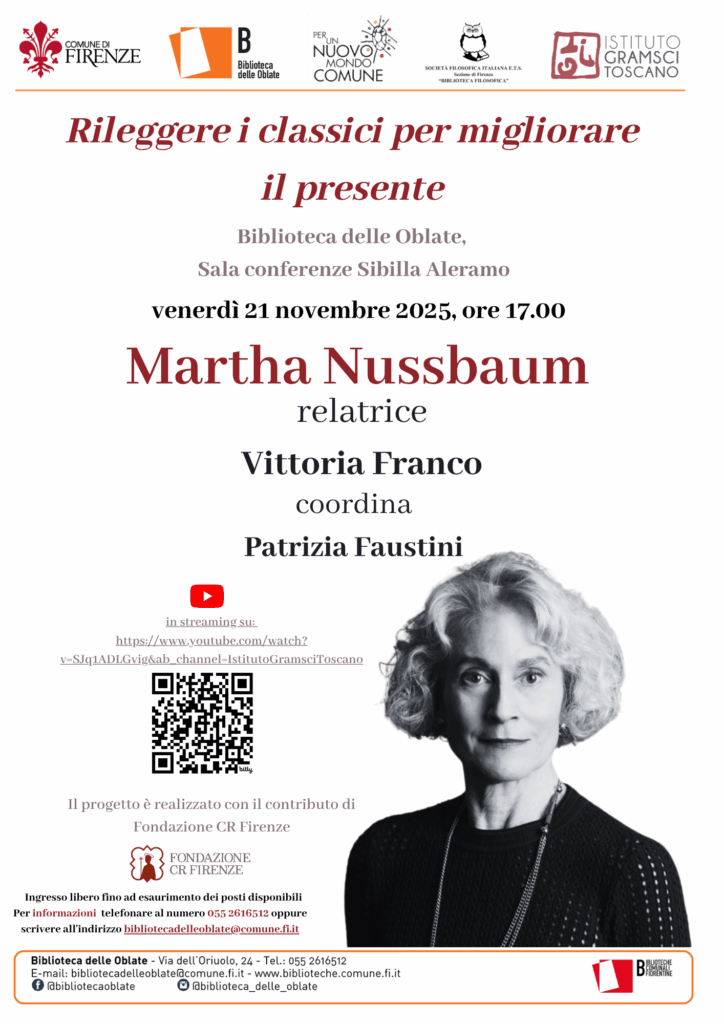 Venerdì 21 novembre alle 17 si svolgerà alla Biblioteca delle Oblate di Firenze il penultimo incontro del ciclo “Rileggere i classici per migliorare il presente” ideato dall’Istituto Gramsci Toscano. Protagonista sarà Martha Nussbaum (New York, 1947), una filosofa statunitense molto influente. A parlare di lei Vittoria Franco, filosofa e presidente dell’Istituto Gramsci Toscano, e Patrizia Faustini.