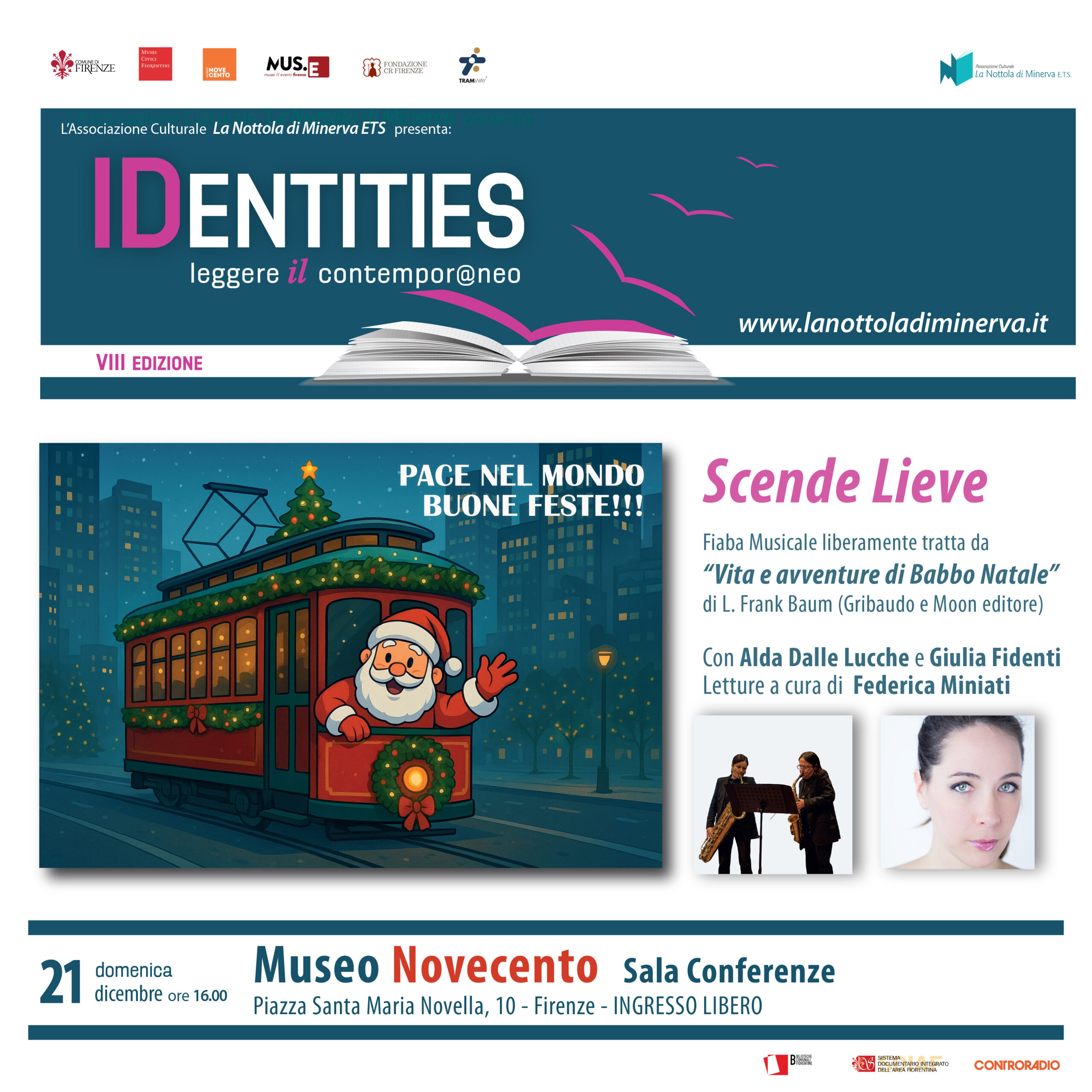 Il reading “Scende lieve” - liberamente tratto da “Vita e avventure di Babbo Natale” di L. Frank Baum, Gribaudo e Moon editore – è in programma domenica 21 dicembre alle 16 nella Sala Conferenze del Museo Novecento a Firenze, in piazza Santa Maria Novella 10.
