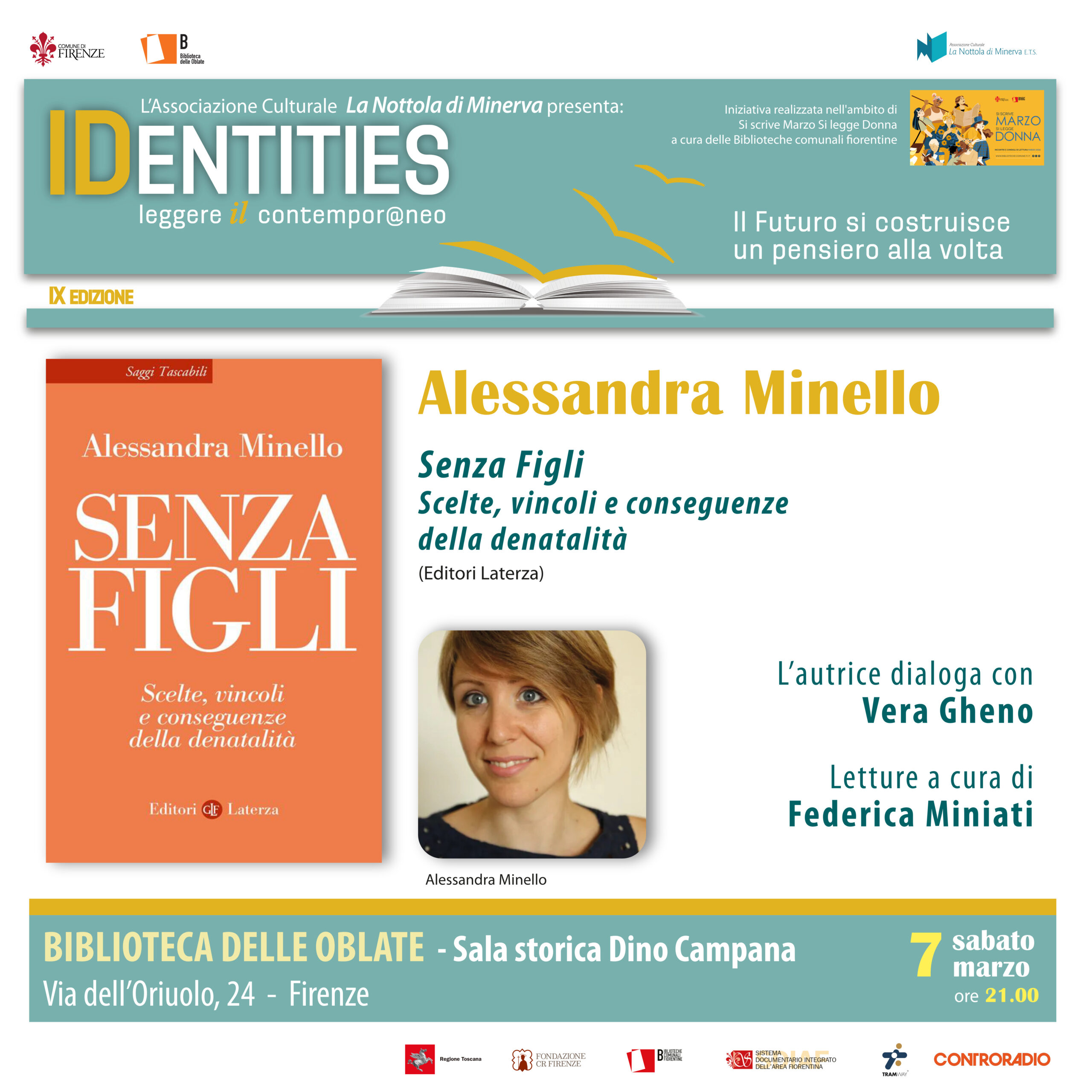 Nell’ambito della rassegna Identities. Leggere il contemporaneo – Il futuro si costruisce un pensiero alla volta, giunta alla IX edizione, sabato 7 marzo alle 21 la Biblioteca delle Oblate (Sala Storica Dino Campana, via dell’Oriuolo 24) di Firenze ospita Alessandra Minello con il volume “Senza Figli. Scelte, vincoli e conseguenze della denatalità” (Editori Laterza). L’autrice dialoga con Vera Gheno; letture a cura di Federica Miniati.