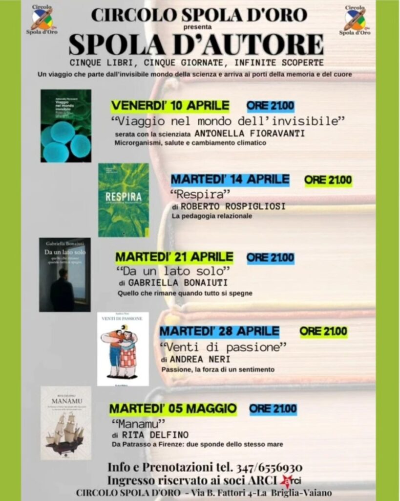Torna al Circolo Spola d’Oro (via Fattori 4) alla Briglia di Vaiano “Spola d’Autore”, rassegna culturale dedicata alla presentazione di libri e all’incontro con autrici e autori. Un ciclo di cinque serate, tutte alle 21, pensato come uno spazio di confronto e condivisione, capace di attraversare linguaggi e temi diversi: dalla scienza alle relazioni, dalle emozioni ai racconti di vita.