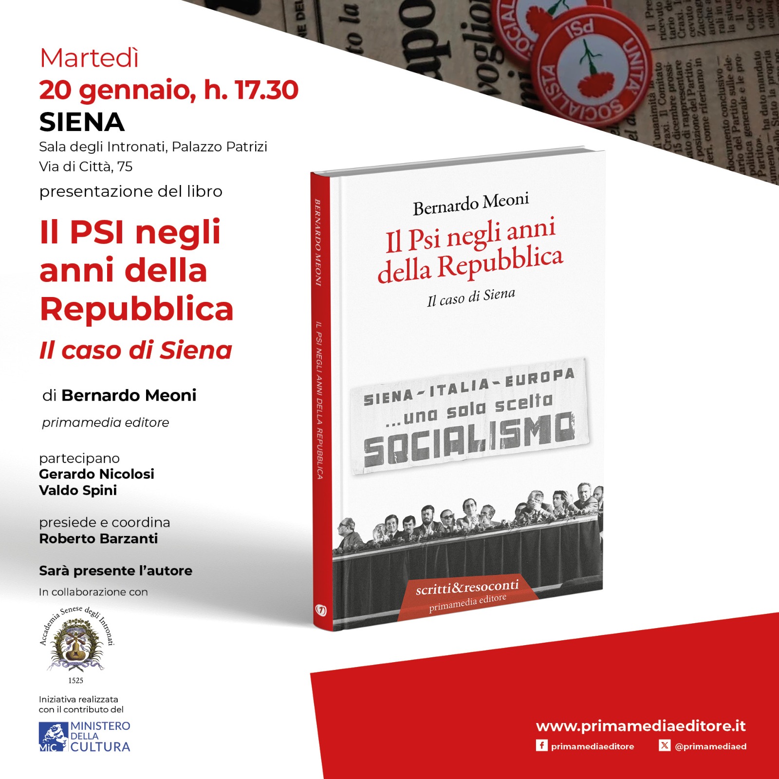Si tratta del saggio di Bernardo Meoni “Il Psi negli anni della Repubblica. Il caso di Siena” (primamedia editore) che verrà presentato martedì 20 gennaio alle 17.30 a Siena, nella Sala degli Intronati di Palazzo Patrizi (via di Città 75), in collaborazione con l'Accademia senese degli Intronati. Oltre all’autore, partecipano Gerardo Nicolosi e Valdo Spini; presiede e coordina Roberto Barzanti.