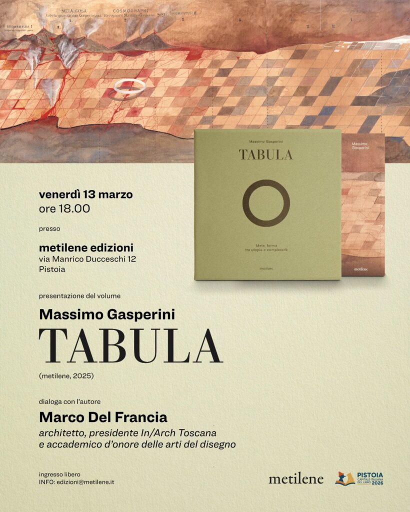 Venerdì 13 marzo alle 18, nella sede di Metilene edizioni a Pistoia (via Manrico Ducceschi 12), si terrà la presentazione del volume "Tabula. Meta_forma tra utopia e complessità" (Metilene) di Massimo Gasperini. A dialogare con l’autore sarà Marco Del Francia, architetto, presidente In/Arch Toscana e accademico d’onore delle arti del disegno.