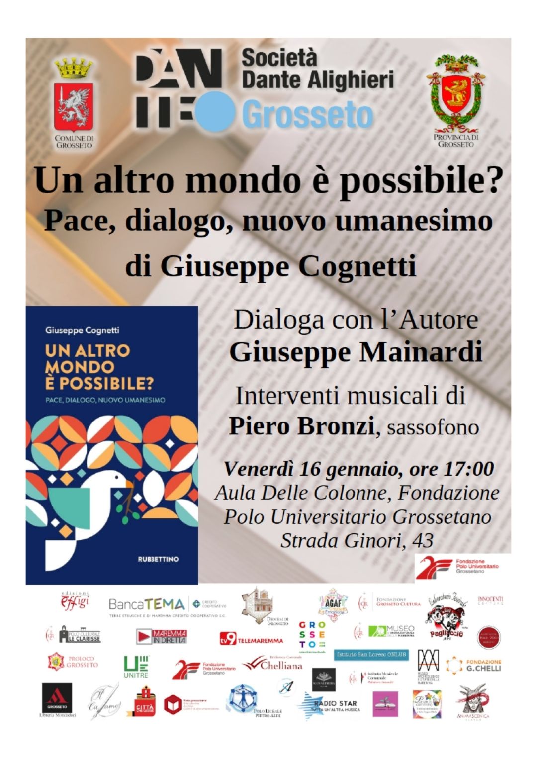 Pace, dialogo e nuovo umanesimo. Venerdì 16 gennaio alle 17, nella sede della Fondazione Polo Universitario di Grosseto (strada Ginori 43, aula Delle Colonne), sarà presentato il libro di Giuseppe Cognetti “Un altro mondo è possibile?". A dialogare con l'autore, Giuseppe Mainardi; il sassofonista Piero Bonzi eseguirà brani musicali.