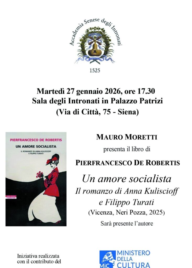 Martedì 27 gennaio alle 17.30 nella Sala degli Intronati di Palazzo Patrizi a Siena, in via di Città 75, a cento anni dalla morte di Anna Kuliscioff, Mauro Moretti (Università per Stranieri di Siena), alla presenza dell'autore, presenta il libro di Pierfrancesco De Robertis “Un amore socialista. Il romanzo di Anna Kuliscioff e Filippo Turati” (Neri Pozza).