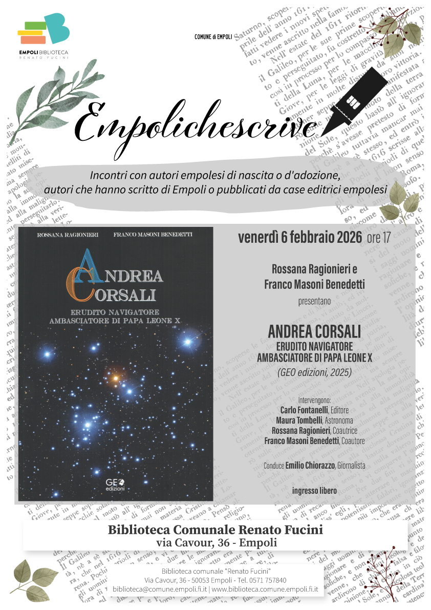 Venerdì 6 febbraio alle 17la biblioteca 'Renato Fucini' di Empoli ospita l'appuntamento con Empolichescrive: Rossana Ragionieri e Franco Masoni Benedetti presenteranno il libro 'Andrea Corsali. Erudito navigatore ambasciatore di Papa Leone X'. Saranno presenti l'editore Carlo Fontanelli e l'astronoma Maura Tombelli. Conduce il giornalista Emilio Chiorazzo. L'evento è a ingresso libero.