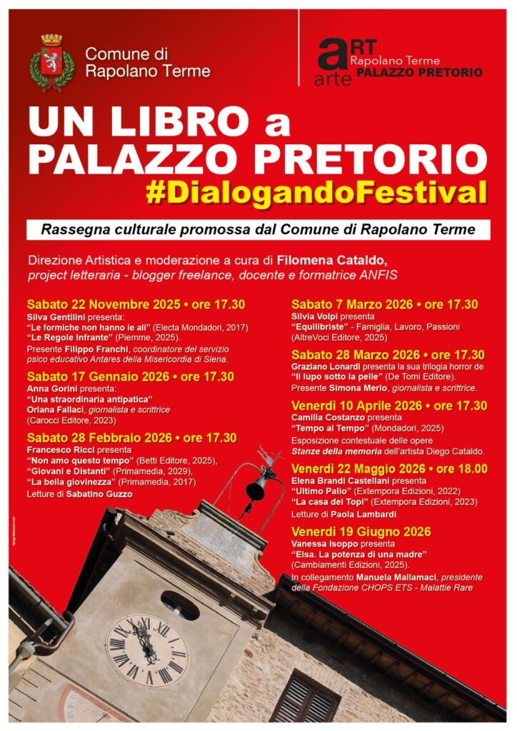 Si intitola “Un libro a Palazzo Pretorio. #Dialogando Festival” la rassegna letteraria promossa dal Comune di Rapolano Terme che prenderà il via sabato 22 novembre e andrà avanti fino a giugno 2026 con 8 appuntamenti dedicati a opere letterarie e autori contemporanei che trattano tematiche sociali e culturali di attualità.