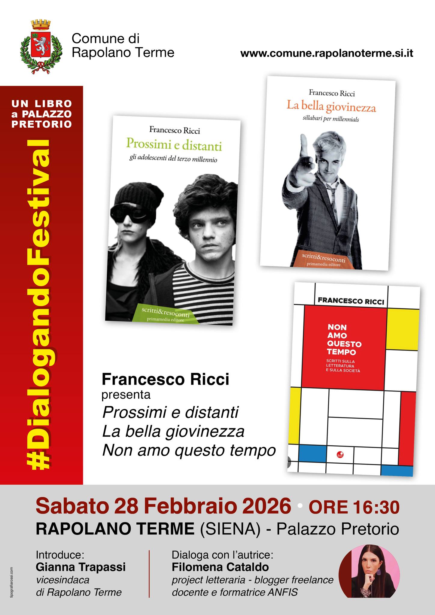 Protagonista sarà lo scrittore e saggista Francesco Ricci che presenterà tre delle sue opere dedicate alle trasformazioni generazionali e ai cambiamenti del nostro tempo: “Prossimi e distanti. Gli adolescenti del terzo millennio” e “La bella giovinezza. Sillabari per millennials” (primamedia editore) e “Non amo questo tempo. Scritti sulla letteratura e sulla società” (Betti Editrice).
