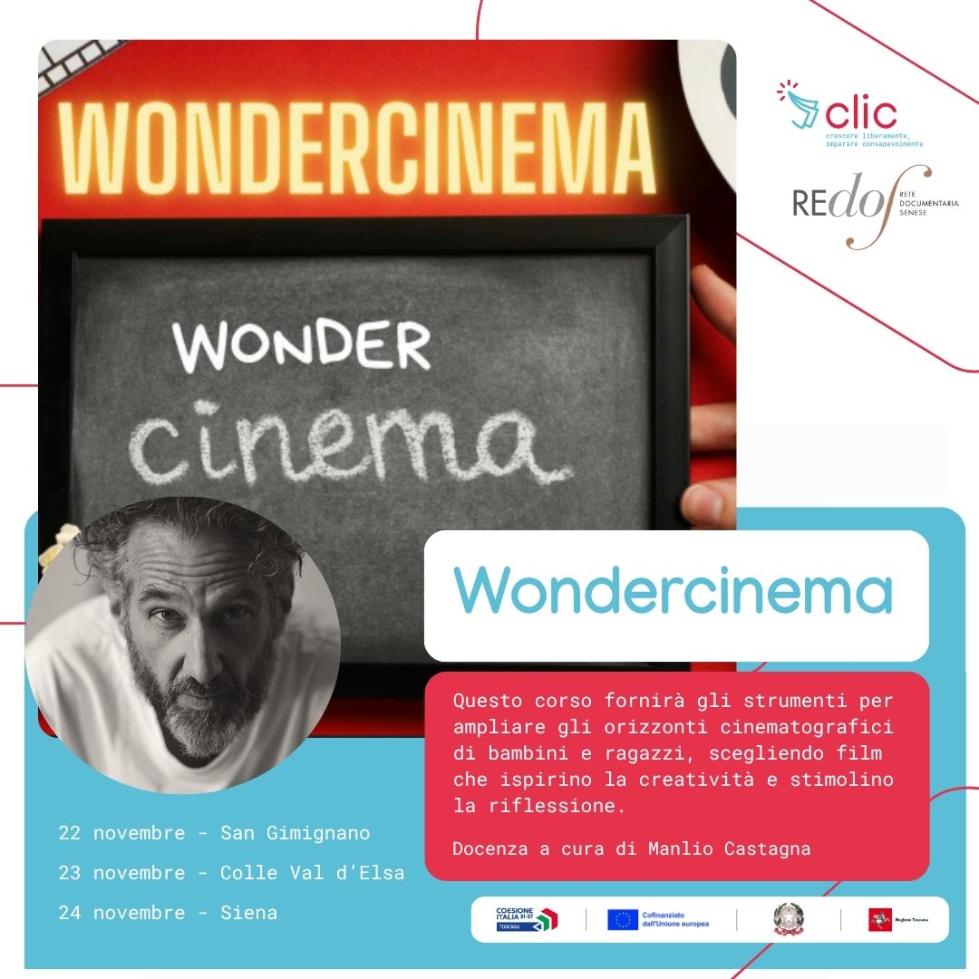 Si tratta di Wondercinema, iniziativa gratuita inserito nell’ambito di “CLIC - Crescere Liberamente, Imparare Consapevolmente”, progetto della Rete Documentaria Senese coordinato dalla Biblioteca comunale degli Intronati di Siena che si è classificato al secondo posto nel bando della Regione Toscana "Giovani e adulti in-formati. Interventi di educazione permanente non formale della popolazione adulta maggiorenne” cofinanziato dall’Unione Europea nell’ambito del Pr Fse+ 2021-2027, priorità 2 "Istruzione e formazione", azione 2.f.10.